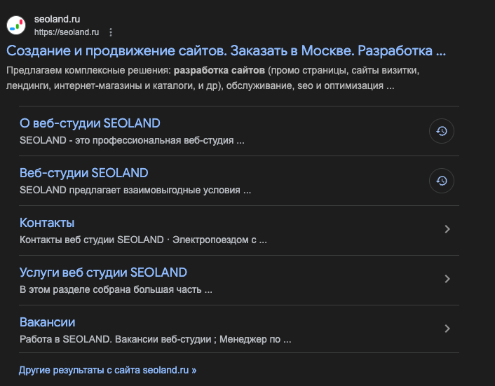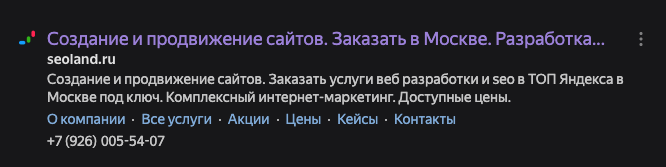 Это дополнительные ссылки под основным сниппетом, которые ведут на важные разделы вашего сайта («Цены», «Портфолио», «Контакты»). Google формирует их автоматически на основе структуры и внутренней перелинковки сайта. В Яндексе вы можете частично управлять ими через Яндекс.Вебмастер. Для этого создайте в разделе «Инструменты» → «Быстрые ссылки» соответствующие правила, указав URL и якорный текст.