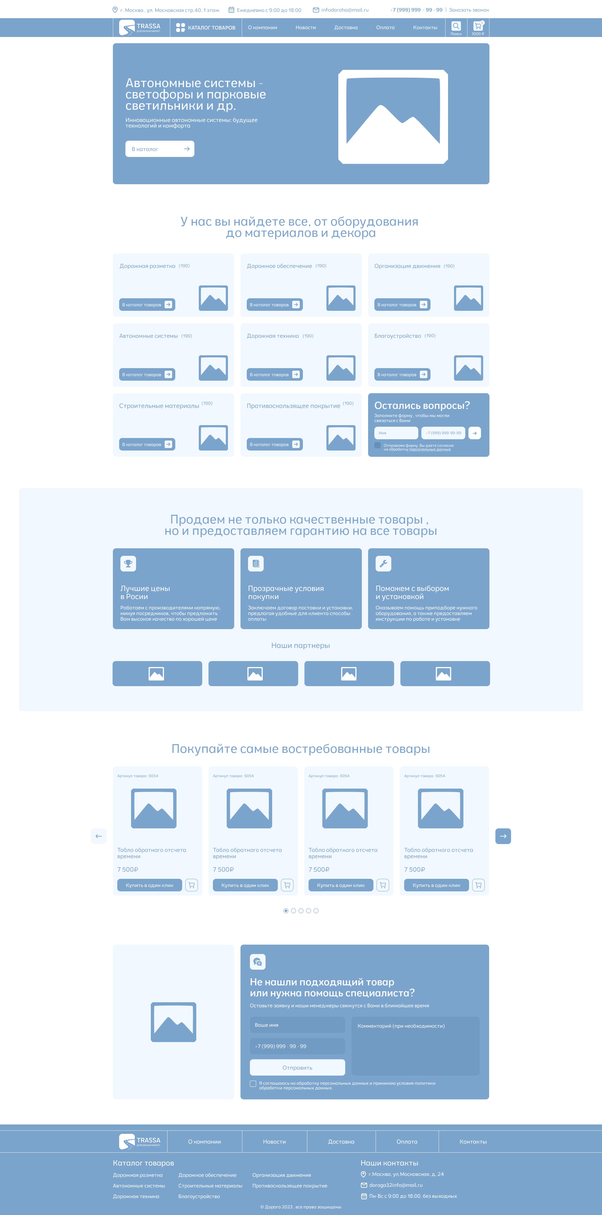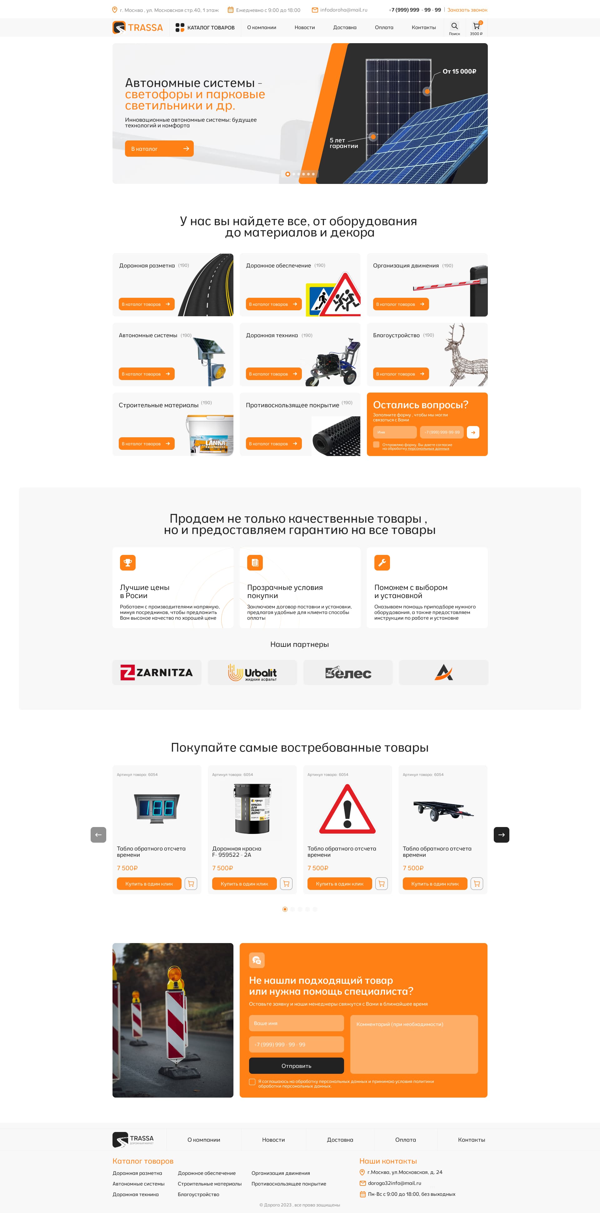 Компания «Строй Трейдинг», игрок на рынке поставок специализированного оборудования (дорожные знаки, техника, автономное освещение, материалы для разметки). Задача заключалась в создании не просто сайта, а полноценного канала продаж, способного обрабатывать входящий поток клиентов из сферы строительства и эксплуатации инфраструктуры. Требовалось разработать удобный инструмент, который позволит клиентам быстро ориентироваться в специфическом ассортименте, изучать технические параметры товаров и выходить на сделку с минимальным участием менеджера на начальном этапе.